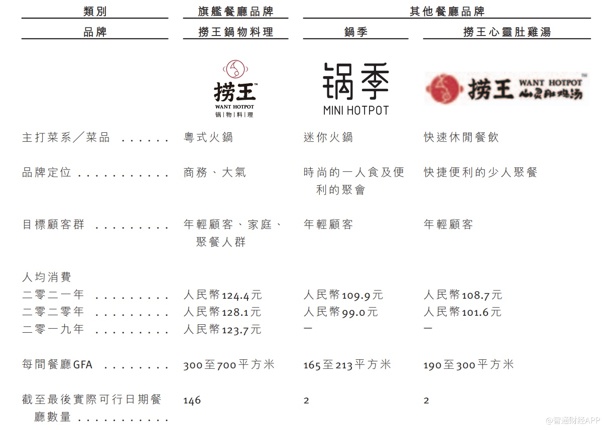捞王控股旗下运营及管理了三个自创的各具特色的品牌,即以提供商务、大气餐膳为主的捞王锅物料理,主打一人食概念的锅季,为少人聚餐提供快捷便利的用餐体验并迎合年轻消费者喜好的快速休闲餐厅捞王心灵肚鸡汤。
