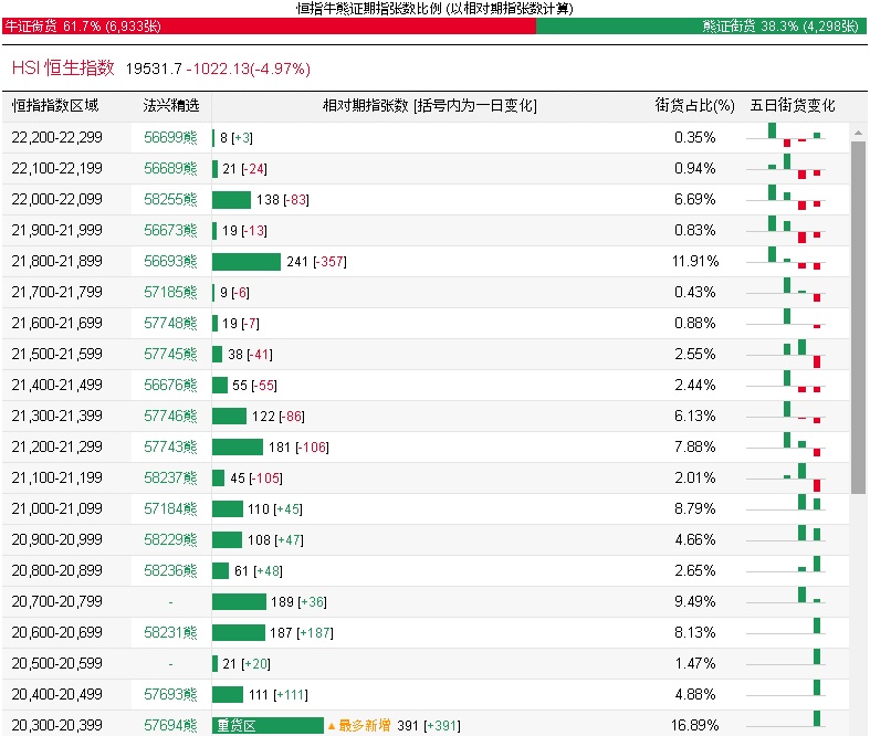 法兴恒指牛熊证街货分布图的数据显示,熊证街货重货区在20300-20399区间,该区间最新熊证数量为391张,较上一交易日增加391张;最多新增在同一区间。