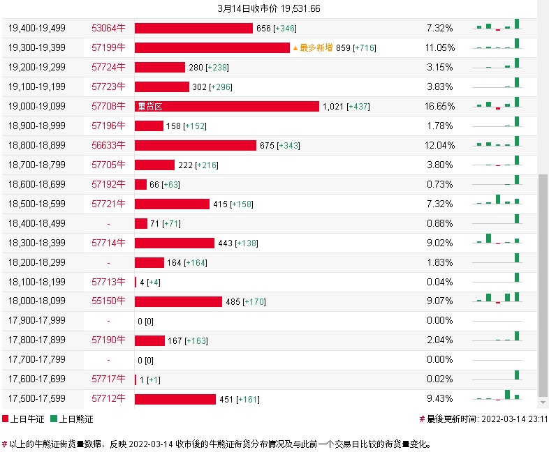 牛证街货重货区在19000-19099区间,该区间最新牛证数量为1021张,较上一交易日增加437张;最多新增在19300-19399区间,该区间最新牛证数量为859张,较上一交易日增加716张。