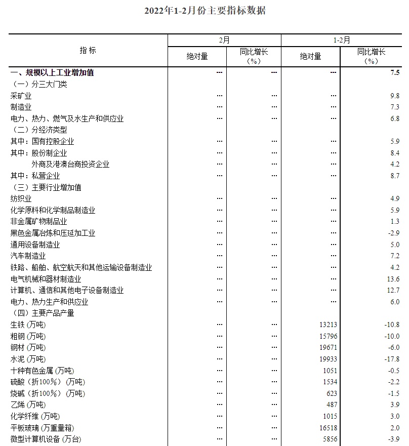 1-2月份,全国规模以上工业增加值同比增长7.5%,比2021年12月份加快3.2个百分点,比2021年两年平均增速加快1.4个百分点。分三大门类看,采矿业增加值同比增长9.8%,制造业增长7.3%,电力、热力、燃气及水生产和供应业增长6.8%。高技术制造业、装备制造业增加值同比分别增长14.4%、9.6%,增速分别比规模以上工业快6.9、2.1个百分点。分产品看,新能源汽车、工业机器人、太阳能电池产量同比分别增长150.5%、29.6%、26.4%。分经济类型看,国有控股企业增加值同比增长5.9%;股份制企业增长8.4%,外商及港澳台商投资企业增长4.2%;私营企业增长8.7%。从环比看,2月份规模以上工业增加值比上月增长0.34%。2月份,制造业采购经理指数为50.2%,比上月上升0.1个百分点;企业生产经营活动预期指数为58.7%,上升1.2个百分点。