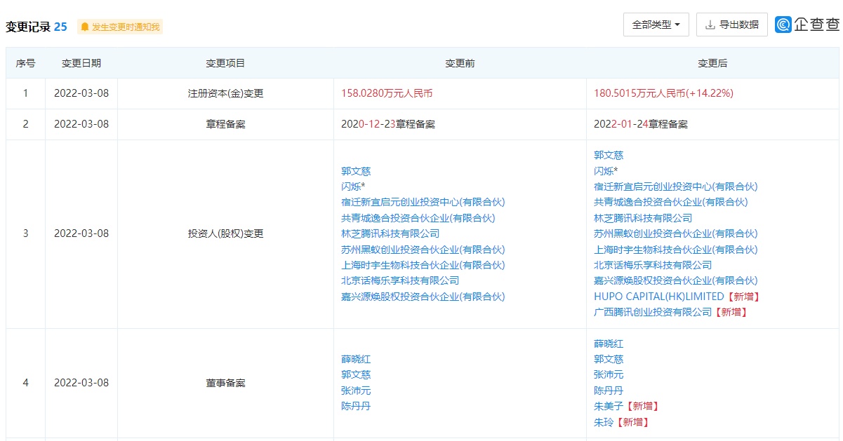智通财经APP获悉,企查查APP显示,近日,PMPM环球配方关联公司上海时垠电子商务有限公司发生工商变更,新增股东广西腾讯创业投资有限公司、HUPO CAPITAL(HK)LIMITED,同时公司注册资本由158.03万人民币增至180.5万人民币,增幅约14.22%。