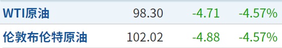 受此消息影响,截至发稿,WTI原油期货价格跌4.57%,报98.30美元/桶;布伦特原油期货价格跌4.57%,报102.02美元/桶。