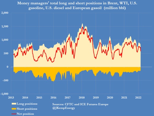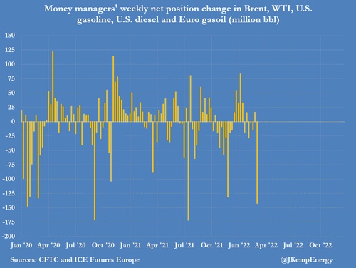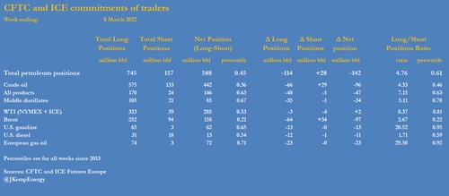 数据显示,在截至3月8日的一周内,对冲基金和其他基金经理卖出了相当于1.42亿桶原油的六大最重要的原油相关期货和期权合约。