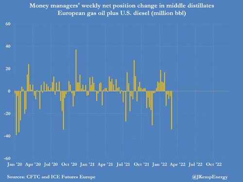据悉,基金经理们卖出的衍生品头寸包括了布伦特原油、欧洲柴油、美国汽油和美国柴油,而只买进了在纽约商品交易所(NYMEX)和洲际交易所(ICE) 进行交易的WTI原油。抛售主要是关闭了现有的看涨头寸,且并未增加新的看跌头寸,这符合降低风险的策略。
