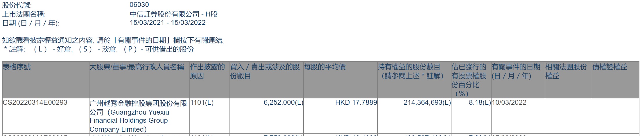 智通财经APP获悉,香港联交所最新资料显示,3月10日,越秀金控增持中信证券(06030)625.2万股,每股作价17.7889港元,总金额约为1.11亿港元。增持后最新持股数目约为2.14亿股,最新持股比例为8.18%。
