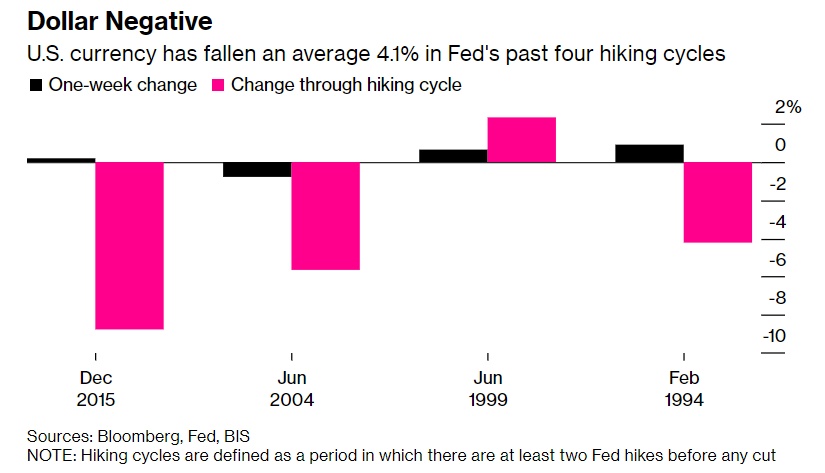 “历史数据表明,当FOMC收紧货币政策时,美元贬值的频率高于升值的频率,尤其是在政策早期阶段。”澳大利亚联邦银行策略师Joseph Capurso 和Carol Kong本周在一份研究报告中写道。他们表示,当美联储进行加息时,大宗商品和亚洲货币兑美元汇率普遍走强,因为投资者在过去往往把加息措施视为改善全球经济增长和资源需求改善的有力信号。