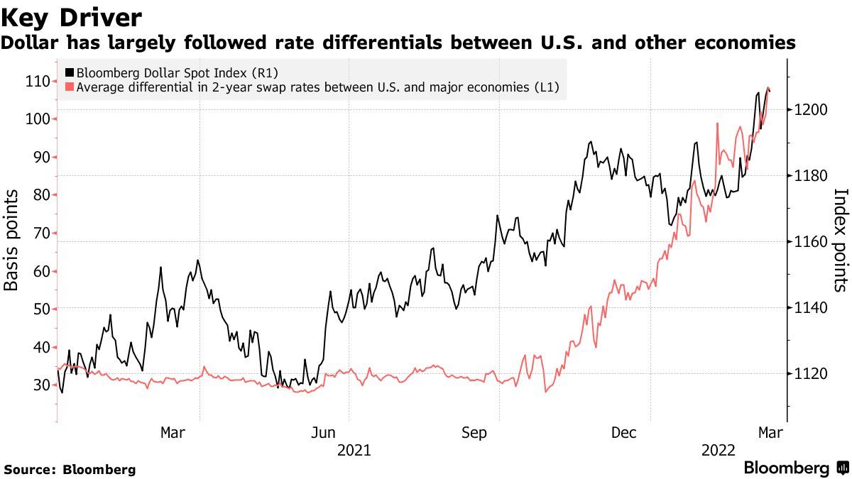 如下图所示,美元的走势在很大程度上追随了美国与其他经济体之间的利差变化。