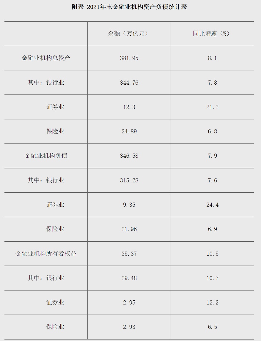 智通财经APP获悉,据央行官网数据初步统计,2021年末,我国金融业机构总资产为381.95万亿元,同比增长8.1%,其中,银行业机构总资产为344.76万亿元,同比增长7.8%;证券业机构总资产为12.3万亿元,同比增长21.2%;保险业机构总资产为24.89万亿元,同比增长6.8%。金融业机构负债为346.58万亿元,同比增长7.9%,其中,银行业机构负债为315.28万亿元,同比增长7.6%;证券业机构负债为9.35万亿元,同比增长24.4%;保险业机构负债为21.96万亿元,同比增长6.9%。