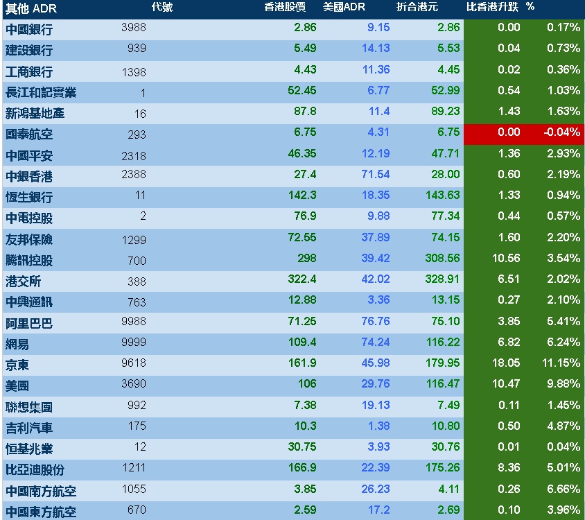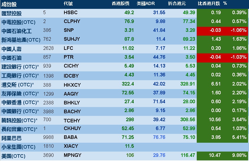 智通财经APP获悉,周二美股三大指数悉数上涨,港股ADR指数上涨,按比例计算,收报18798点,较香港收市涨382.53点或2.03%。