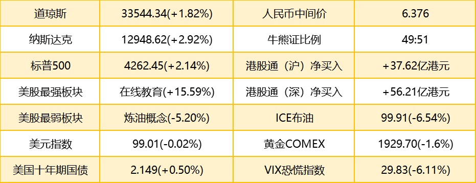 1. 隔夜美股收盘,道指收盘上涨599.10点,涨幅为1.82%,报33544.34点;纳指涨367.40点,涨幅为2.92%,报12948.62点;标普500指数涨89.34点,涨幅为2.14%,报4262.45点。纳斯达克中国金龙指数结束三连跌,收涨4.98%。港股ADR指数上涨,按比例计算,收报18798点,较香港收市涨382.53点或2.03%。明日凌晨关注美联储议息会议,加息25个基点概率大,关注鲍威尔讲话对未来加息和缩表节奏的看法。市场对紧缩预期消化比较充分,关注靴子落地后情绪能否反转。