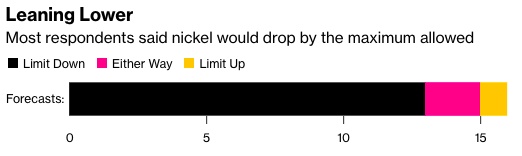 调查的16名分析师和交易员中,有13人预计镍价将会跌至伦敦金属交易所本周宣布的5%的新跌停板,该涨跌停板是为了给市场带来秩序。1人表示,价格将会涨停,而另外两位则表示,两种情况都有可能出现。