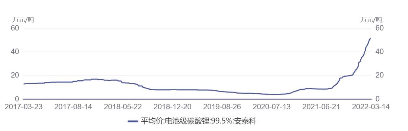 据悉,目前国内电池级碳酸锂平均价已突破50万元/吨,截至3月14日报价为51.20万元/吨,这意味这该价格较2021年底以来上涨逾85%,较2021年初以来上涨近10倍,涨势不可谓不惊人。除此之外,其它锂产品价格亦呈现出了不同程度的涨幅。