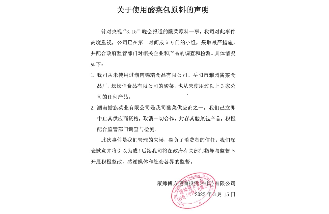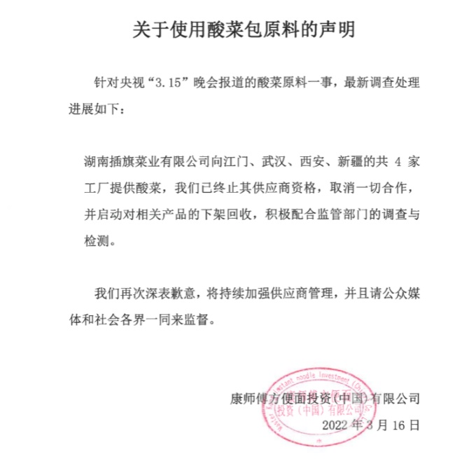 智通财经APP获悉,3月16日,康师傅方便面投资(中国)有限公司再次发布声明称,湖南插旗菜业有限公司向江门、武汉、西安、新疆共4家工厂提供酸菜,康师傅已终止其供应商资格,取消一切合作,并启动对相关产品的下架回收,积极配合监管部门的调查与检测。