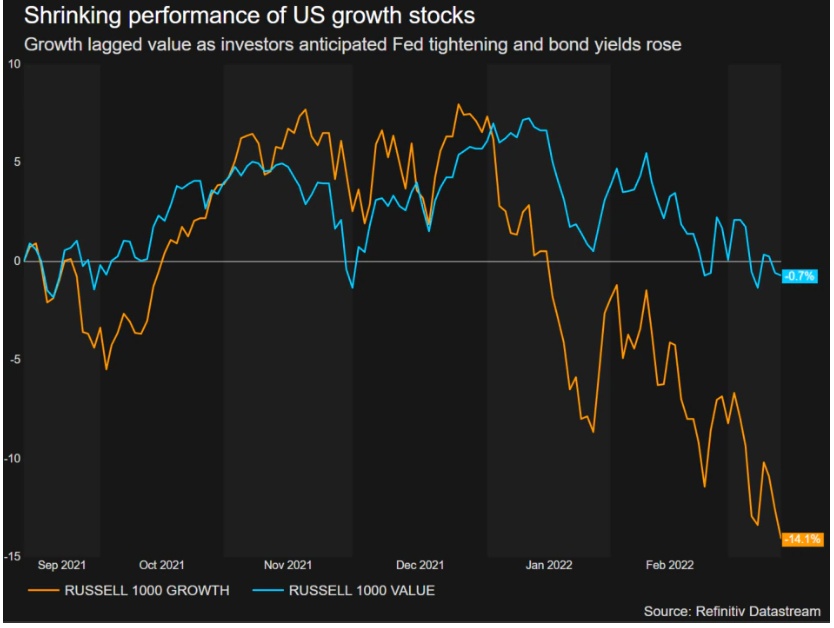 从2022年开始,标普500指数已经下跌超过10%,而以科技股为主的纳斯达克综合指数则基本上在熊市边缘徘徊,从去年11月的历史高点下跌逾20%。科技股和成长型股票表现不佳,主要原因之一是美债收益率不断抬升使得这些股票估值所依赖的未来现金流价值不断承压。