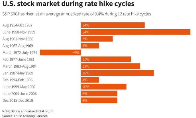 Truist联席首席投资官Keith Lerner在一份报告中写道:“在联邦基金利率上调的时期,美股往往会实现上涨,因为这通常伴随着健康的经济增长和企业不断增长的利润。”