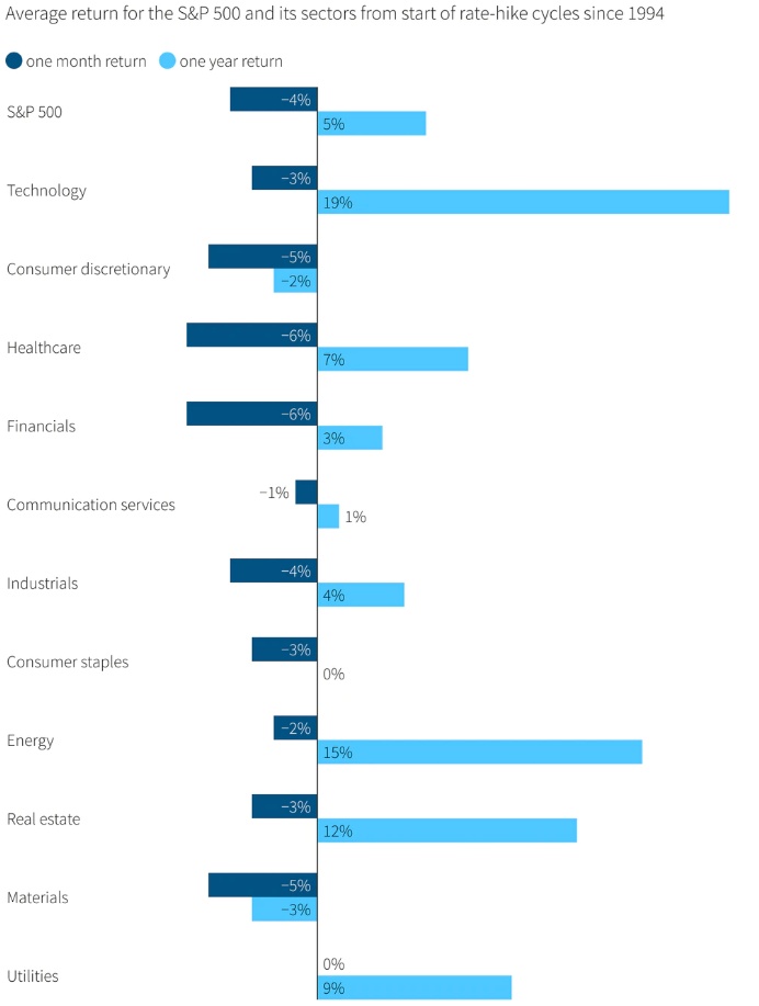 不可否认的一点是,短期内加息措施往往会给美股带来巨大压力。Evercore ISI对美联储最近四个加息周期进行分析后发现,标普500指数在周期开始后的第一个月平均下跌约4%。