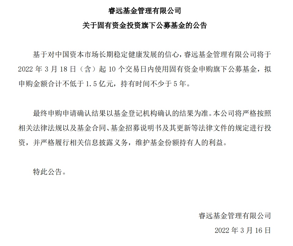 智通财经APP获悉,3月16日,睿远基金管理有限公司发布公告表示,基于对中国资本市场长期稳定健康发展的信心,睿远基金管理有限公司将于2022年3月18日(含)起10个交易日内使用固有资金申购旗下公募基金,拟申购金额合计不低于1.5亿元,持有时间不少于5年。