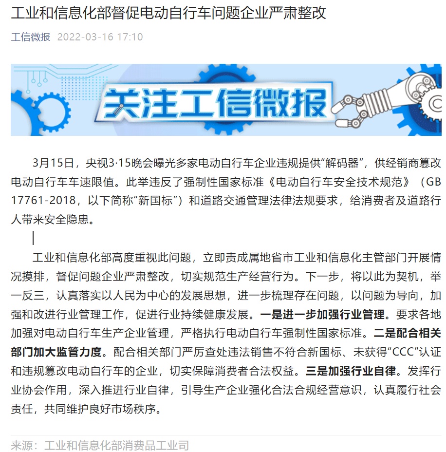 智通财经APP获悉,据工信部公众号消息,3月15日,央视3·15晚会曝光多家电动自行车企业违规提供“解码器”,供经销商篡改电动自行车车速限值。工业和信息化部高度重视此问题,立即责成属地省市工业和信息化主管部门开展情况摸排,督促问题企业严肃整改,切实规范生产经营行为。下一步,将以此为契机,举一反三,认真落实以人民为中心的发展思想,进一步梳理存在问题,以问题为导向,加强和改进行业管理工作,促进行业持续健康发展。
