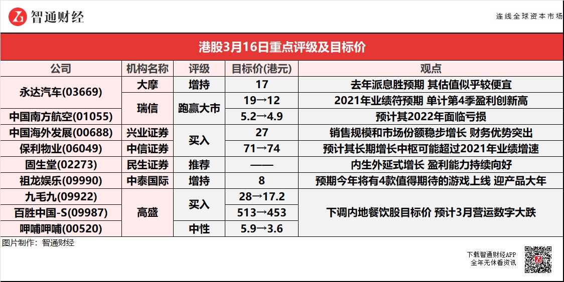 瑞信维持中国南方航空(01055)“跑赢大市”评级,目标价由5.2港元下调5.8%至4.9港元;在新的油价、交通和成本预测下,预计2022年面临亏损和2023E年盈利预测削减3%。该行指出,近期挑战依然存在,但其在国内市场的实力应该继续在2022年,捕捉长期的国内交通带动的复苏。