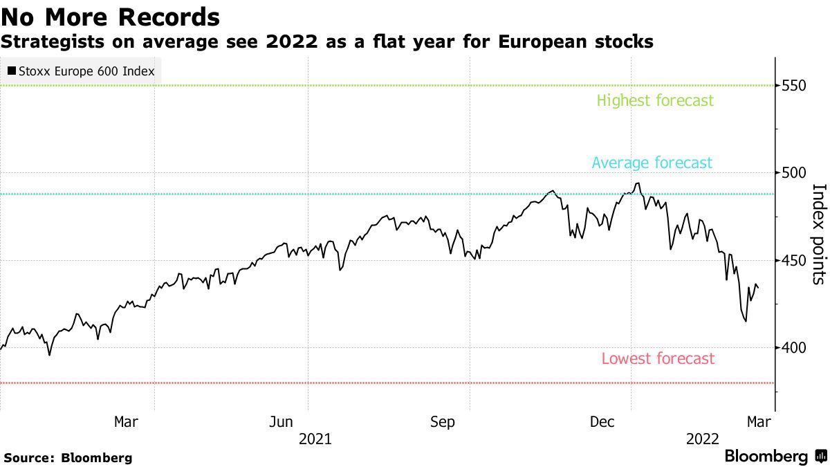 在俄乌冲突升级、油价暴涨以及欧洲央行出人意料的强硬立场影响之下,仅仅一个月左右策略师们对该指数目标点位的平均下调幅度约3.7%,部分人士甚至将预期下调了12%。
