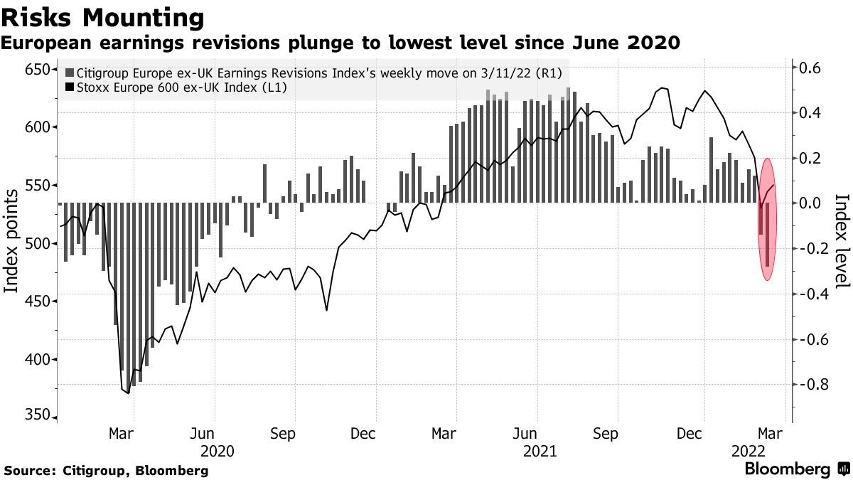 除了金融机构,投资者们也在采取行动。美国银行3月份的全球基金经理调查数据显示,在过去一个月里,投资者对欧元区的资产配置比例骤减,净减持约18%,这是自2020年5月以来投资者首次大幅减持欧元区资产。如下图所示,欧洲地区的盈利修正暴跌至2020年6月以来的最低水平。
