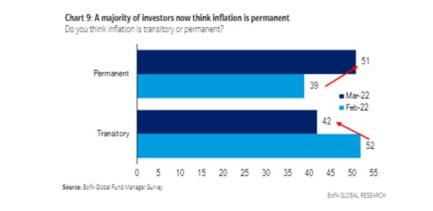 在通胀预期方面,据美国银行调查发现,俄乌冲突升级在一定程度上改变了市场情绪。大多数投资者如今认为通胀将是永久性的,而在俄乌冲突升级之前,他们仍相信通胀仅是暂时的。