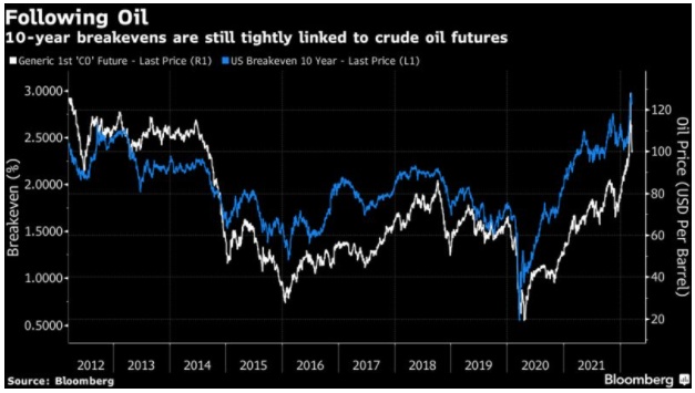 与此同时,油价正对市场产生的通胀预期造成严重破坏。但现在油价的上涨应该对未来10年的平均通胀率没有任何影响。如果有任何轻微的影响,更高的价格将意味着现在更高的基数,并且应该对未来产生较低的预期。