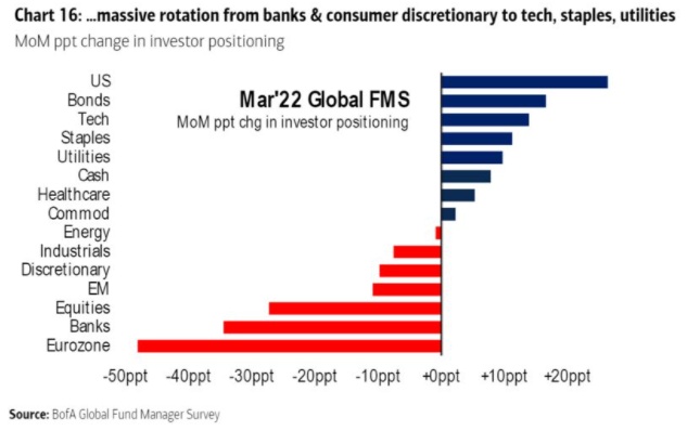 在资产配置方面,投资者在俄乌冲突升级后,反应非常强烈。欧元区的资产目前已经大幅转向美国,以及目前被认为风险较低的股票行业,包括科技行业。