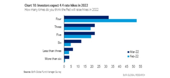 而参与美国银行调查的基金经理们普遍同意这一观点,调查显示,相比起在上个月这些基金经理们充满信心地认为美联储将在2022年加息四次之后,这个月认为加息五、六次的可能性大幅上升。