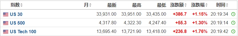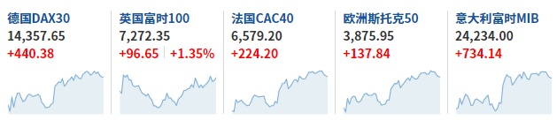 2. 截至发稿,德国DAX指数涨3.17%,英国富时100指数跌1.35%,法国CAC40指数涨3.54%,欧洲斯托克50指数涨3.67%。