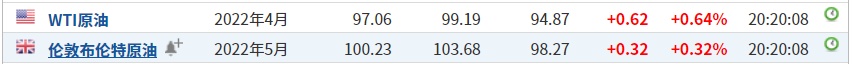 3. 截至发稿,WTI原油涨0.64%,报97.06美元/桶。布伦特原油涨0.32%,报100.23美元/桶。
