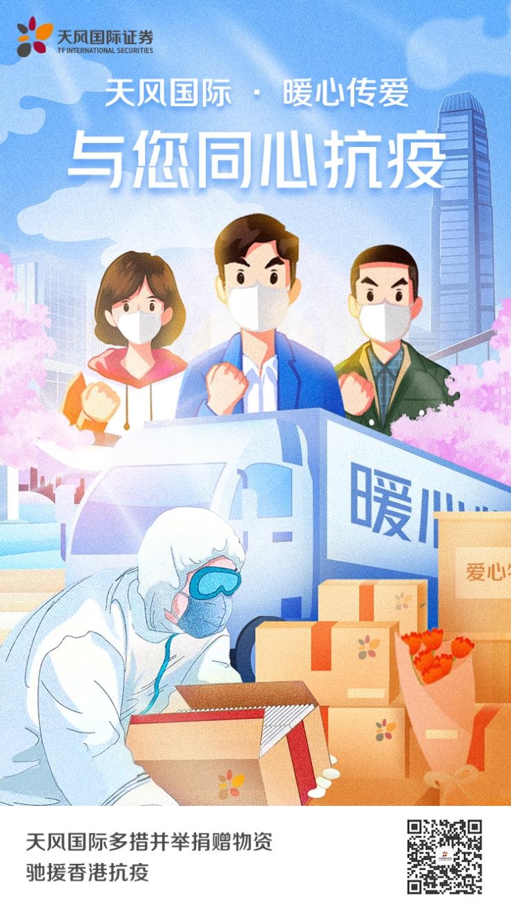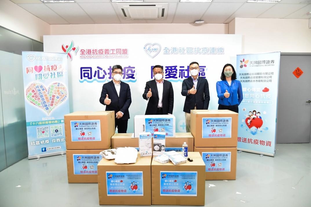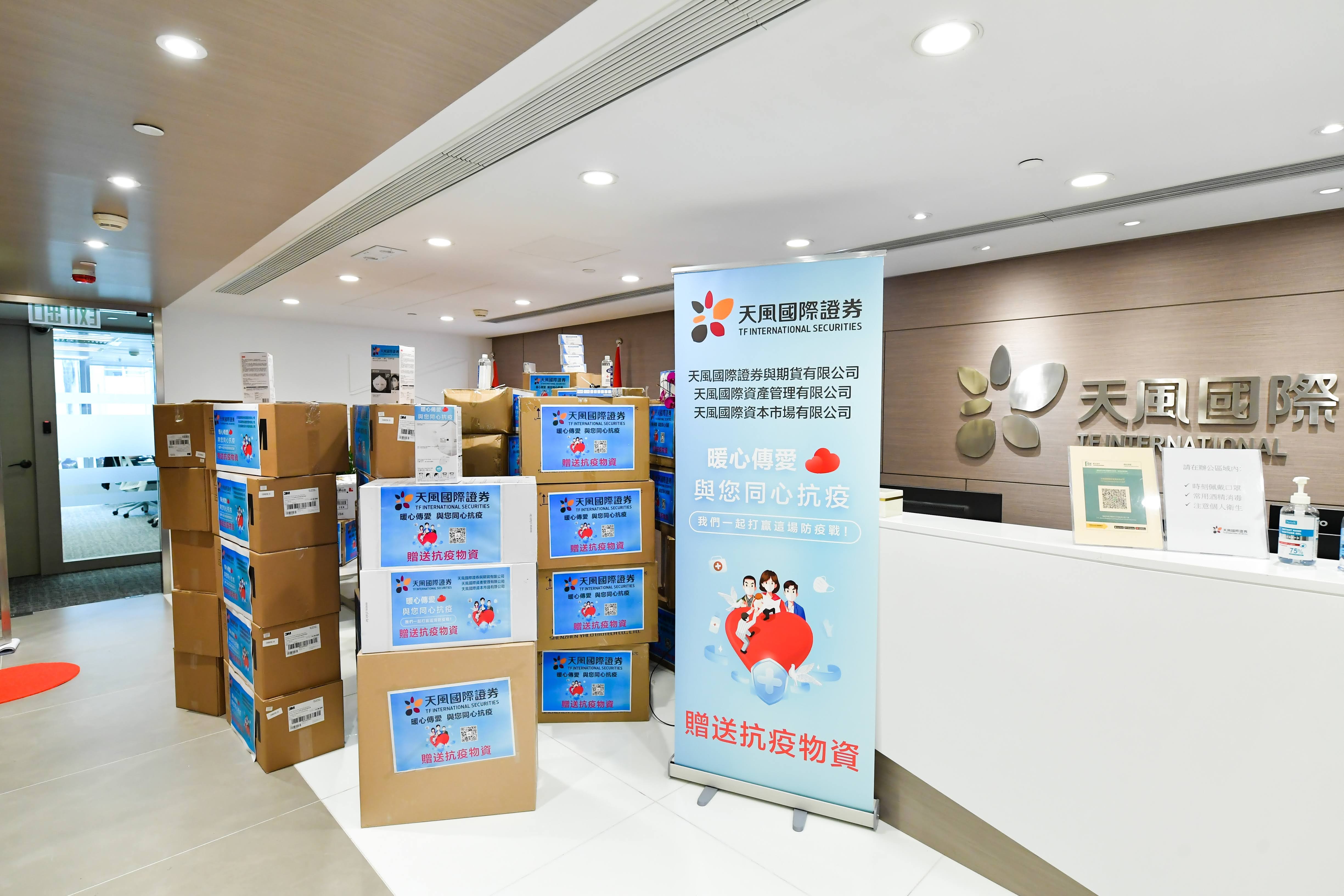 自年初香港第五波疫情爆发以来,日增确诊人数不断创高,各社区检测中心病毒采样点持续面临人手严重不足及检测资源告急的窘境。社会基本经济活动遭受重创,居民日常生活极为不便,防疫工作困难重重,不少家庭正经历着颇为严重的负面情绪及心理压力。时下,天风国际心系香港同胞,深感坚定不移决心抗疫之重要性,秉承患难与共、反馈社会的宗旨,特向受影响严重的社区居民援赠现时较为紧缺的抗疫物资,包括:快速检测试剂盒1.5万盒;优质N95口罩1.5万个;酒精喷雾550樽;若干防护服、防护面罩及空气消毒机等。