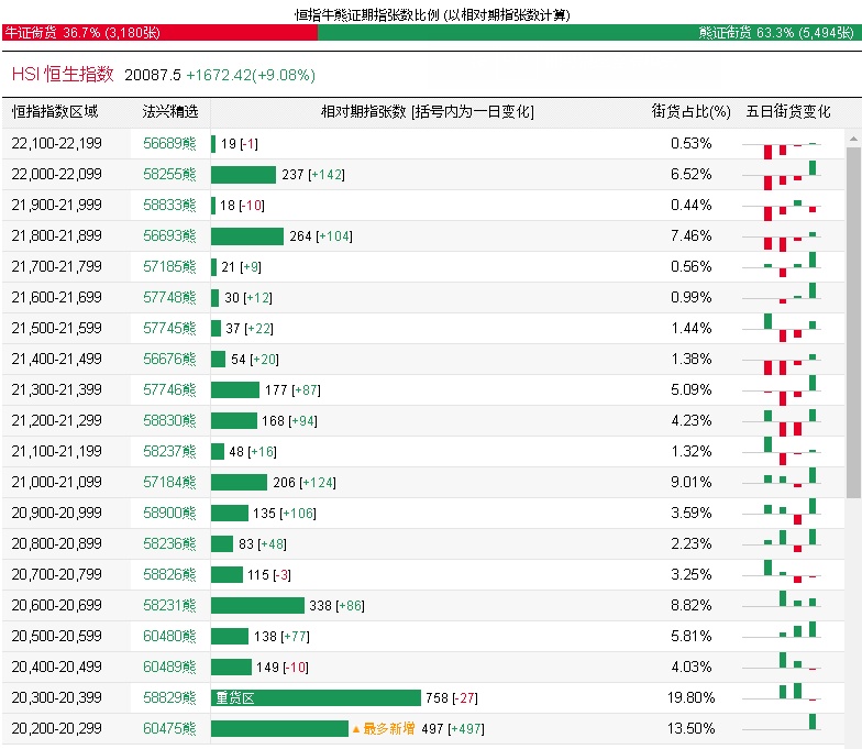 法兴恒指牛熊证街货分布图的数据显示,熊证街货重货区在20300-20399区间,该区间最新熊证数量为758张,较上一交易日减少27张;最多新增在20200-20299区间,该区间最新熊证数量为497张,较上一交易日增加497张。