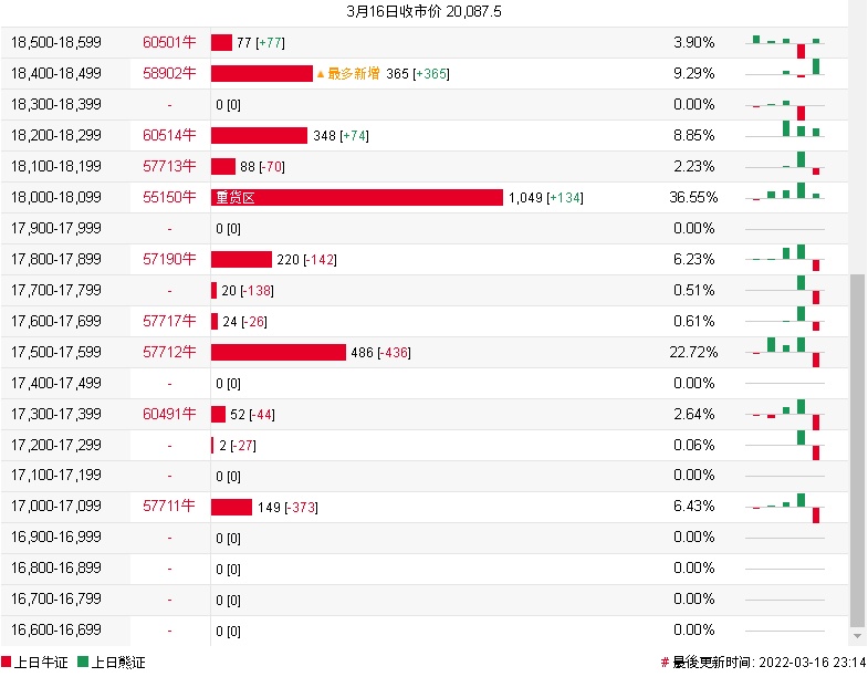 牛证街货重货区在18000-18099区间,该区间最新牛证数量为1049张,较上一交易日增加134张;最多新增在18400-18499区间,该区间最新牛证数量为365张,较上一交易日增加365张。