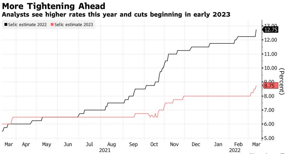拉丁美洲经济学家Adriana Dupita表示:“巴西央行的决定和指引为它赢得了一些时间来评估乌克兰快速变化的事件和大宗商品价格的变化。我们认为,在5月份Selic上调至12.75%之后,巴西央行有可能将紧缩周期延长至适度水平,尤其是如果通胀预期继续上升的话。”
