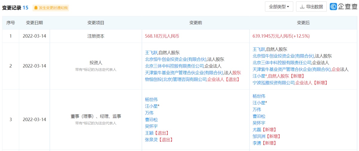 智通财经APP获悉,企查查APP显示,北京三体高创科技有限公司于3月14日发生工商变更,新增股东包括雅戈尔全资子公司宁波泓雅投资有限公司等。
