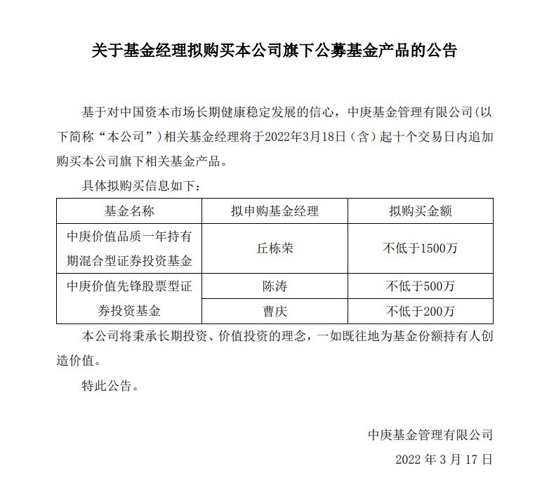 智通财经APP获悉,3月17日,中庚基金发布公告,中庚价值品质基金、中庚价值先锋基金自3月18日起开放日常申购。同时,上述基金的三位基金经理将信心自购(自2022年3月18日(含)起十个交易日内),其中丘栋荣将申购中庚价值品质基金不低于1500万元、陈涛将申购中庚价值先锋基金不低于500万元、曹庆将申购中庚价值先锋基金不低于200万元。