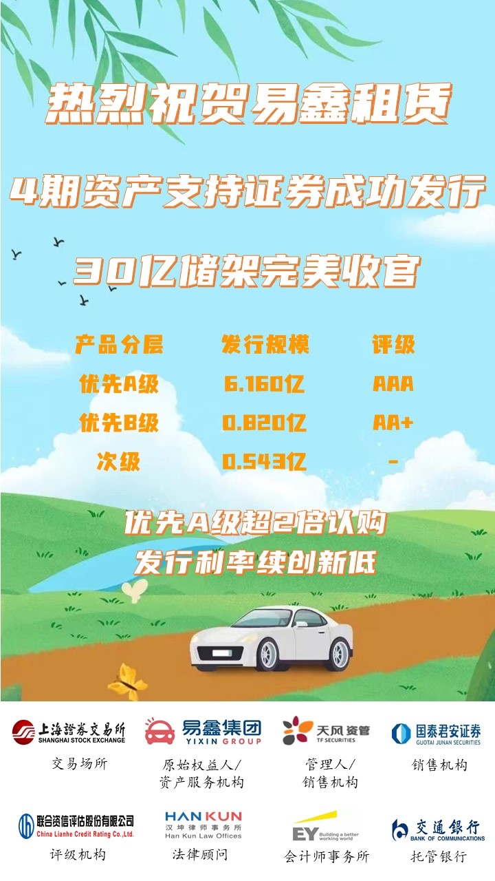 公司表示,未来易鑫租赁将继续秉持审慎的态度展业,继续加强风控管理,坚持以金融服务汽车实体产业,坚持服务好每一位消费者和每一位客户,做到“行稳致远”,为ABS市场持续提供优质资产。