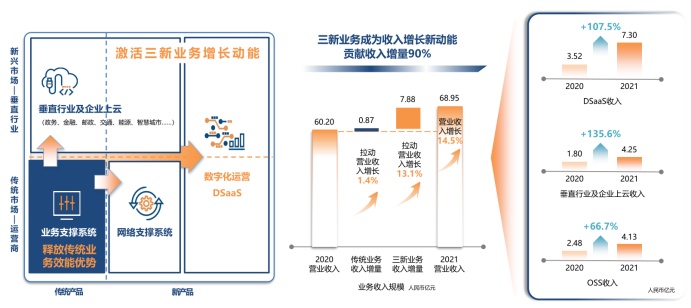 回顾亚信科技近两三年的发展脉络,自2019年底正式确立“一巩固、三发展”五年发展战略以来,公司战略重心正式转移至“巩固传统BSS领域基本面,积极发展OSS、DSaaS和垂直行业及企业上云三新业务”之上。