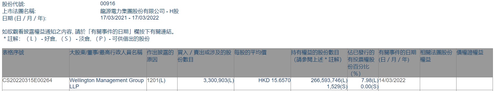 智通财经APP获悉,香港联交所最新资料显示,3月14日,Wellington Management Group减持龙源电力(00916)330.0903万股,每股作价15.6570港元,总金额约为5168.22万港元。减持后最新持股数目约为2.67亿股,最新持股比例为7.98%。
