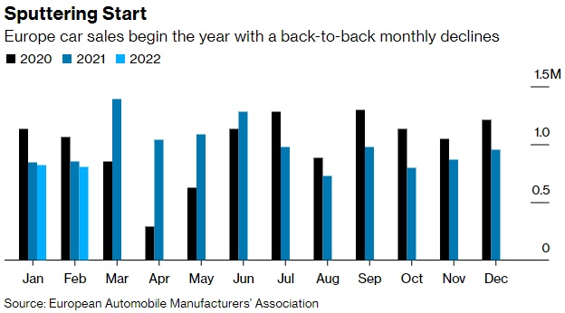 以Michael Dean为首的Bloomberg Intelligence分析师在一份报告中表示:“在俄乌冲突导致停产和零部件短缺前,欧洲的汽车需求已经不温不火,而这一事件又进一步推迟2022年欧洲汽车销售的复苏。”