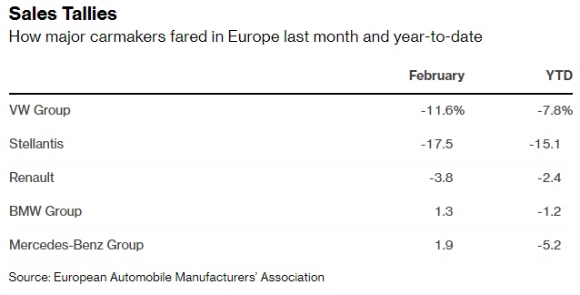欧洲汽车制造商协会(ACEA)周四表示,欧盟2月新车注册量下降6.7%至不到72万辆。加上英国和欧洲自由贸易联盟国家后,销量则下降5.4%,降幅大于1月,并为连续第八个月出现下滑。