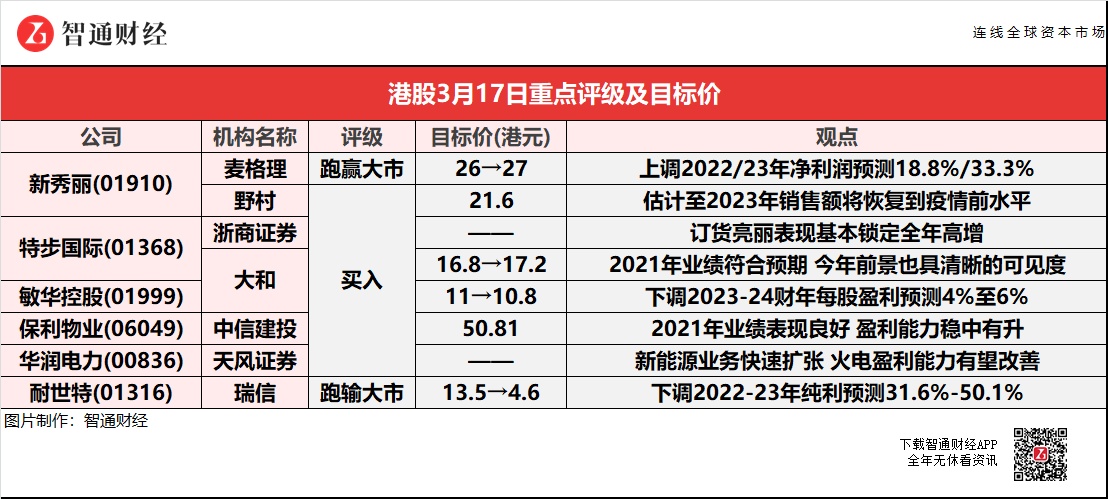 麦格理重申新秀丽(01910)“跑赢大市”评级,目标价由26港元上调至27港元;上调2022/23年净利润预测18.8%/33.3%,以考虑强劲的经营杠杆和毛利率恢复。报告中称,新秀丽去年纯利1430万美元,相比上一年度亏损12.78亿美元,亏转盈。尽管新秀丽可能会因俄乌事件和疫情带来一些短期不利因素,但由于旅行需求,复苏趋势应该会继续。新秀丽管理层预计,2022年第一季营业额与2019年相比将下降25%-27%,并维持全年15%-20%的下降指引,意味着按季改善,并有信心毛利率达55%。