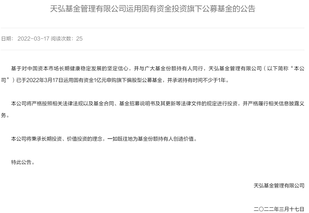 智通财经APP获悉,3月17日,天弘基金发布公告,基于对中国资本市场长期健康稳定发展的坚定信心,并与广大基金份额持有人同行,天弘基金管理有限公司已于2022年3月17日运用固有资金1亿元申购旗下偏股型公募基金,并承诺持有时间不少于1年。公司将秉承长期投资、价值投资的理念,一如既往地为基金份额持有人创造价值。