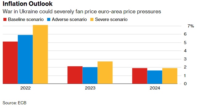 欧洲央行目前预计,俄乌冲突影响下,欧元区今年的经济增长率将比之前预期减少0.5个百分点,不过仍然可以达到3.7%,2023年预计为2.8%,2024年预计为1.6%。欧元区通胀水平2022年将达到5.1%,远高于2%的目标,不过将在2023年降至2.1%,2024年降至1.9%。