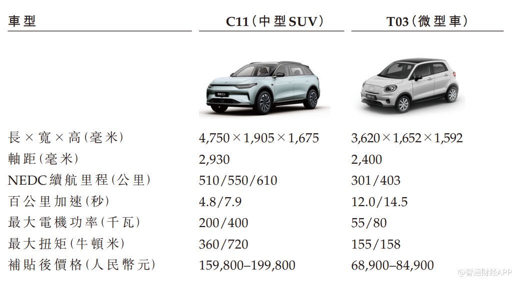 零跑于2020年5月开始交付智能纯电动微型车T03。按2021年中国新兴电动汽车公司推出的单一纯电动车型C端上险量计,T03在畅销车型中位居第三。该公司于2021年10月开始交付中型智能纯电动SUV C11。