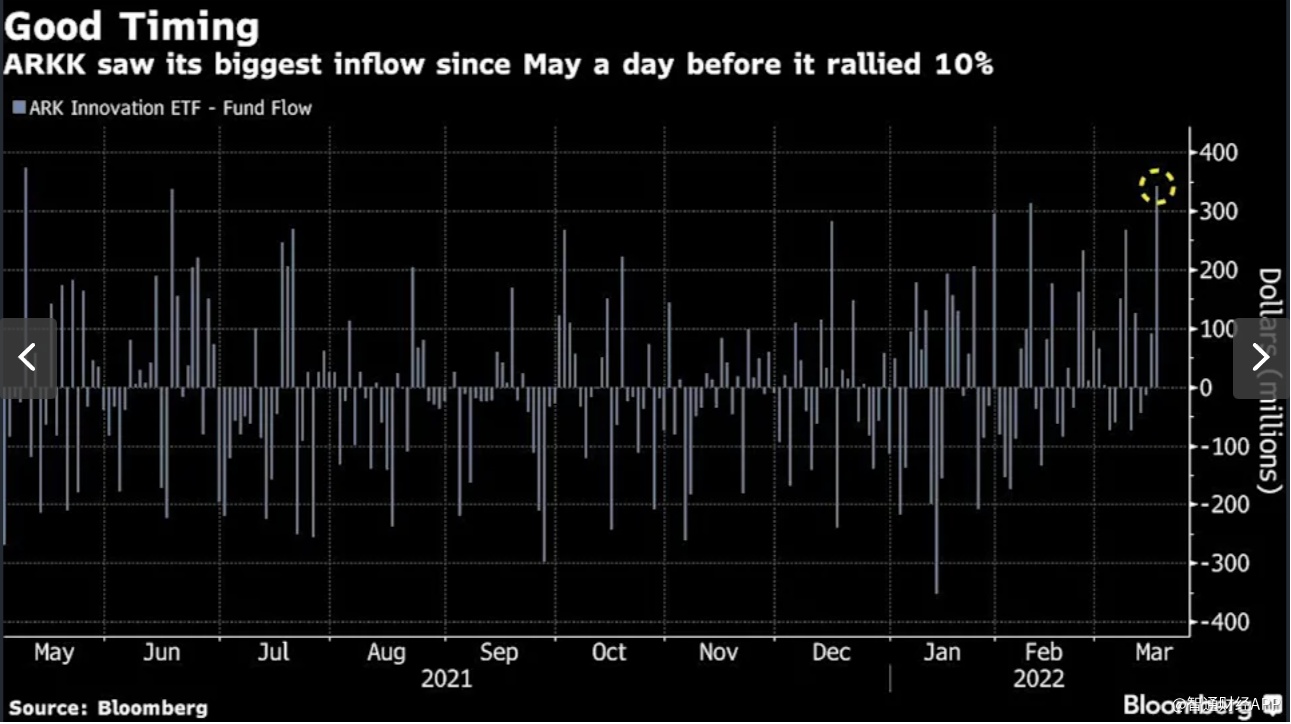 彭博情报公司的James Seyffart表示,资金持续流入ARKK还可能是因为一些投资者试图把握住大跌结束的时机,因为该基金的价格已经跌到了2020年春季的水平。