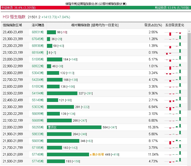 法兴恒指牛熊证街货分布图的数据显示,熊证街货重货区在22000-22099区间,该区间最新熊证数量为584张,较上一交易日增加347张;最多新增在21600-21699区间,该区间最新熊证数量为449张,较上一交易日增加419张。