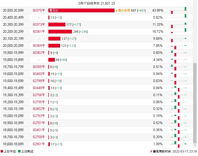 牛证街货重货区在20500-20599区间,该区间最新牛证数量为687张,较上一交易日增加687张;最多新增在同一区间。