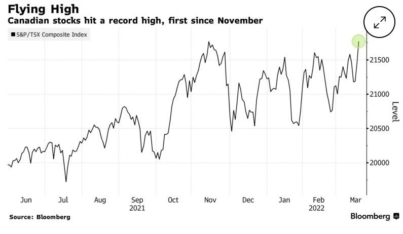 据了解,标准普尔/多伦多证交所综合指数在周四上涨1.4%,这是自去年11月12日以来,首次收于新的纪录高位。由于目前全球市场受到石油供应紧缺、经济增长存在不确定性和利率环境上升的影响,能源和材料类股今年表现强劲,这成为加拿大股市中表现最佳的两个板块。Baskin Wealth Management的首席投资官Barry Schwartz表示,"资金目前集中在金融、能源和大宗商品领域。在利率和通胀不断上升,且俄乌冲突可能升级的情况下,这些板块是资金的好去处。"
